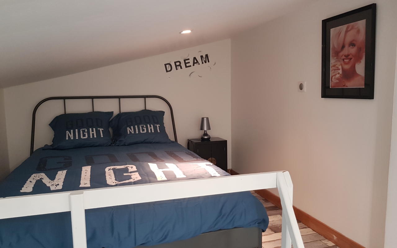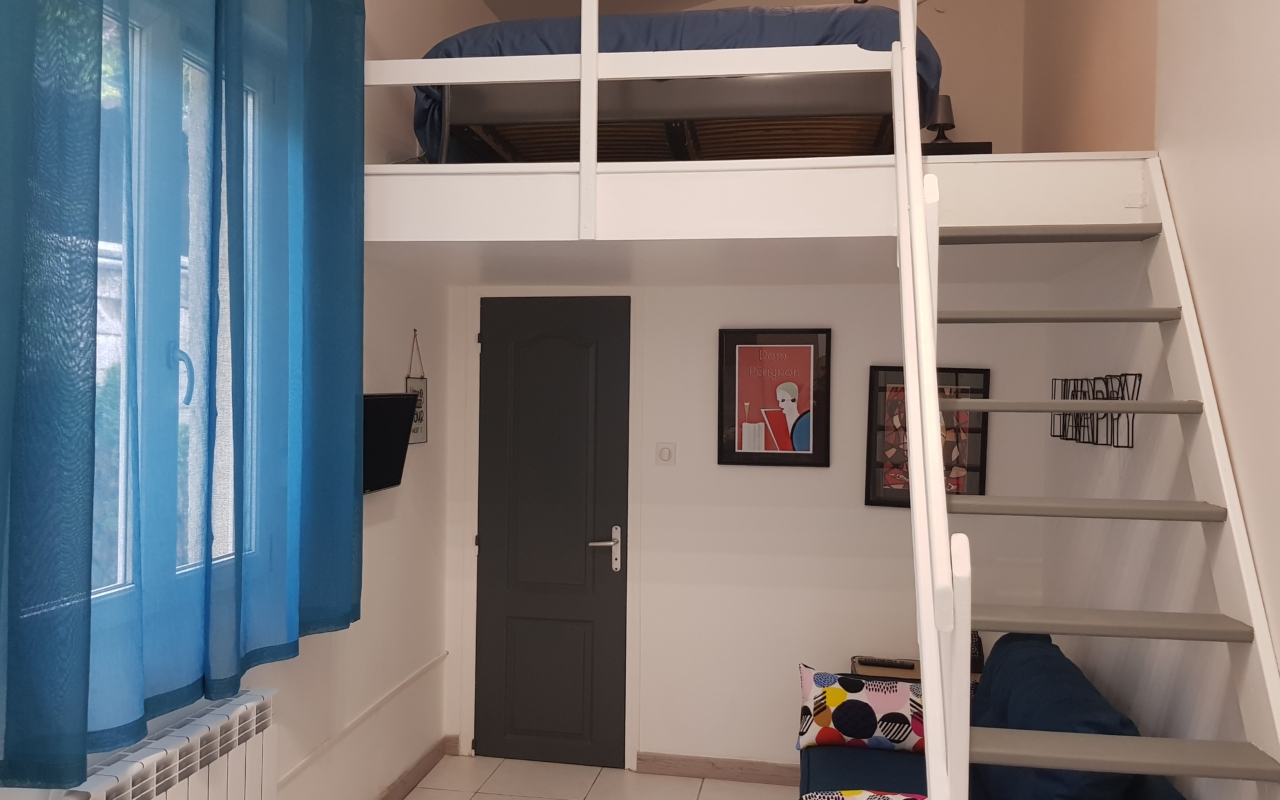 Un couchage en mezzanine dans un lit confortable 140×200 et un canapé Déplimousse sont également disponible pour 1 adulte ou 2 enfants. La capacité de couchage peut donc être de 4 personnes.